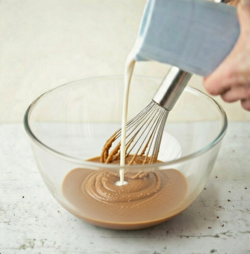 Incorporate the hot milk: Gradually pour the hot milk over the hazelnut butter, a little at a time, whisking to create a smooth, even mixture.